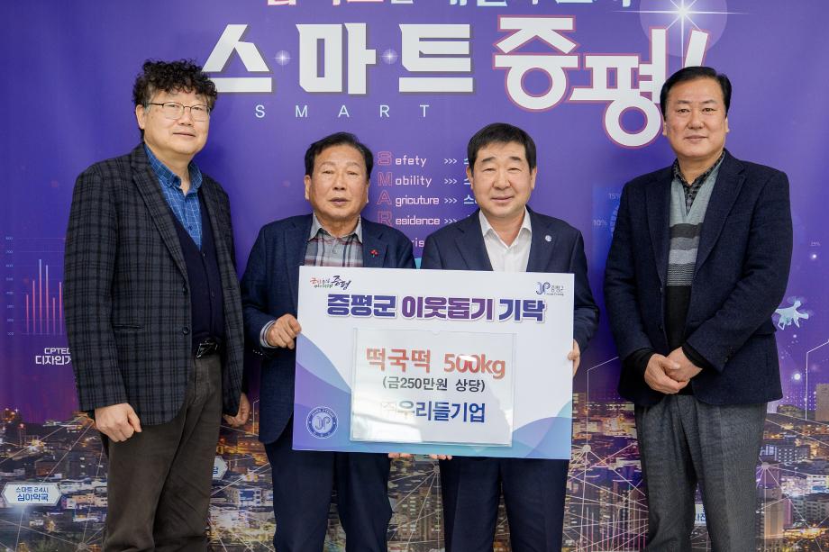 충북 증평군은 ㈜우리들기업이 12일 군청을 방문해 지역 내 취약계층에게 전달해 달라며 떡국떡 500kg(250만 원 상당)을 기탁했다고 밝혔다.