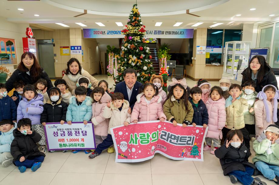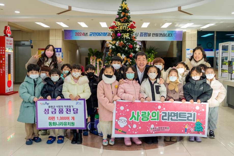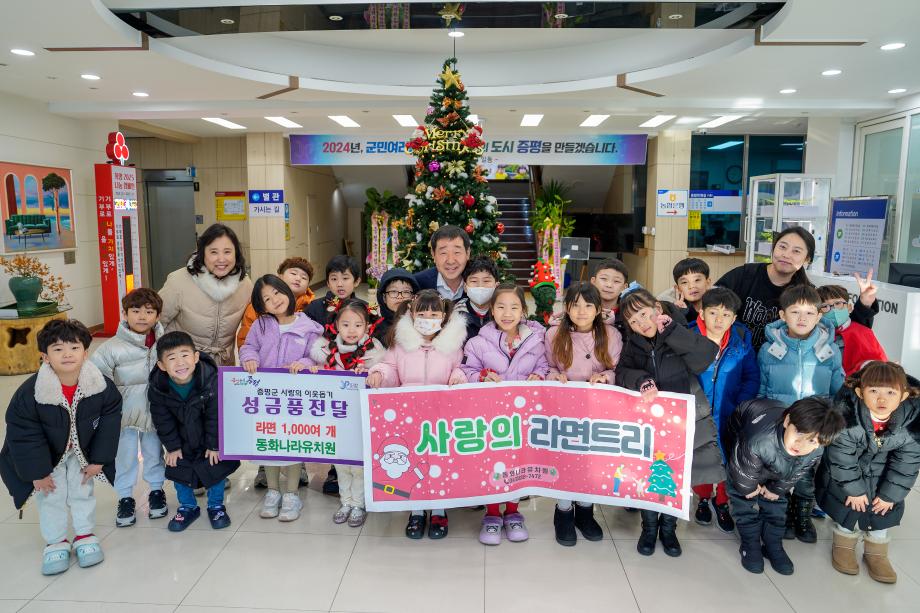 충북 증평군은 동화나라유치원(원장 정미영)이 24일 군청에 방문해 라면 1042개를 기탁했다고 밝혔다.