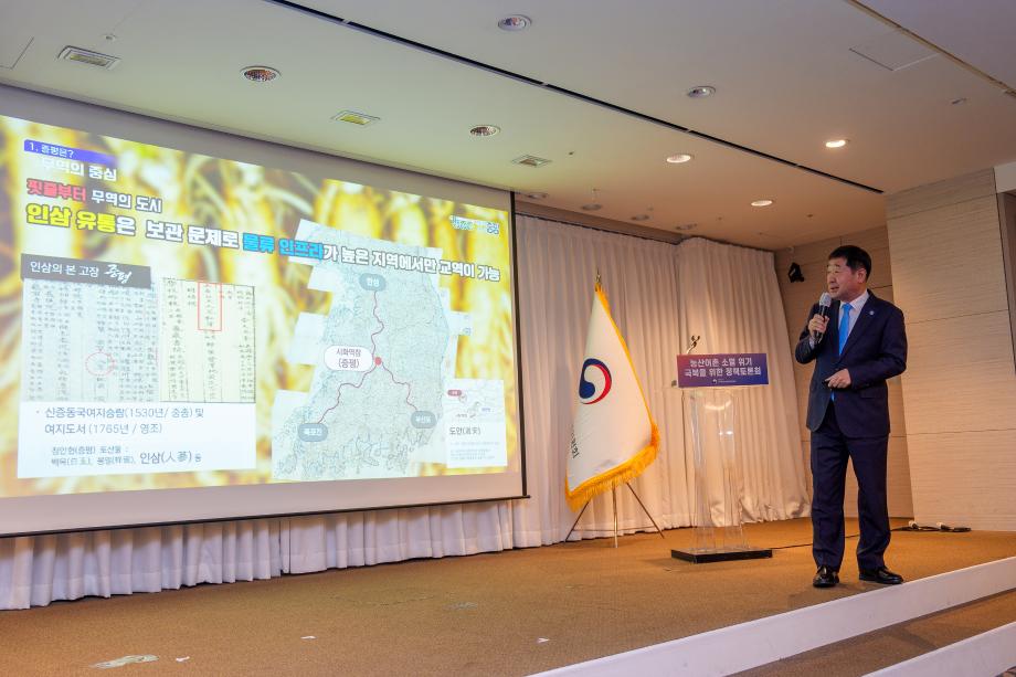 이재영 증평군수가 5일 로얄호텔서울(서울 중구)에서 열린 농산어촌 소멸 위기 극복 정책토론회에서 ‘돌봄 위의 도시 증평’을 주제로 증평군의 지역소멸 및 저출산 극복 사례를 발표했다.